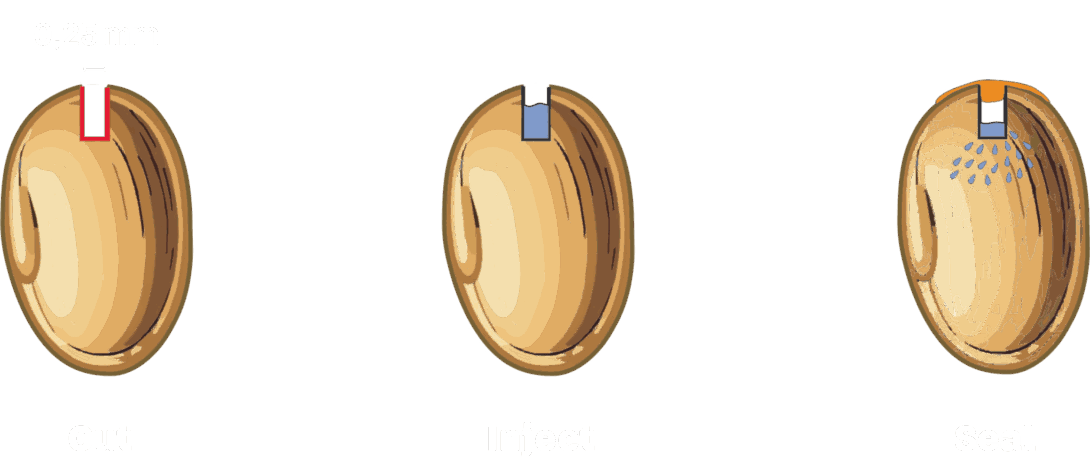 Through a microscopic opening, we gently introduce living microorganisms directly into the seed’s core. Unlike surface coatings that wash away, dry out, or lose efficacy, SeedJection™ protects microbes under the seed’s natural armor. This way, the microbes stay viable, active, and effective when it matters most: in the field, under real conditions.